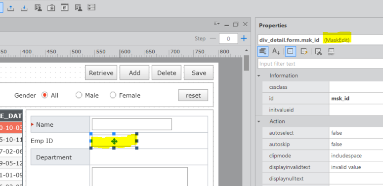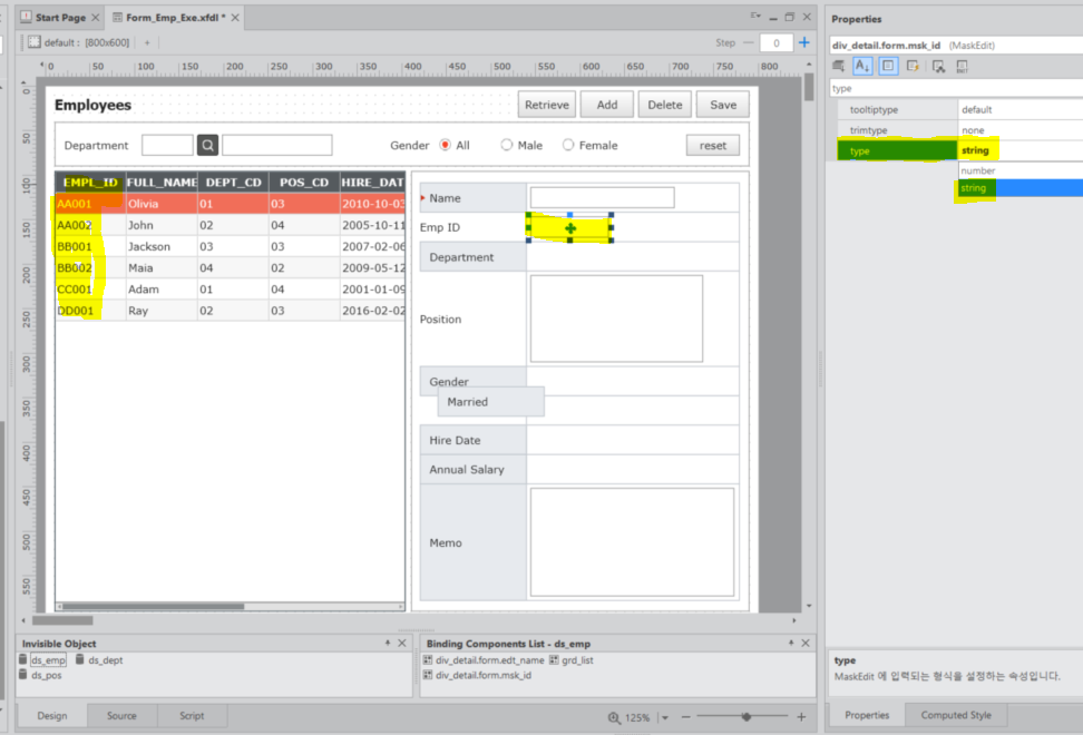 6-1. MaskEdit 컴포넌트는 두 개의 속성을 체크해야 한다. 첫 번째 속성 탭을 선택하고 type 속성을 확인해야 한다 type를 설정해야 하는데 해당 type는 Dataset의 EMPL_ID를 가지고 판단을 한다 그런데 EMPL_ID는 AA001, AA002로 되어 있기 때문에 데이터 타입이 string type 이다. 그렇기 때문에 Type 설정값을 string로 설정한다
