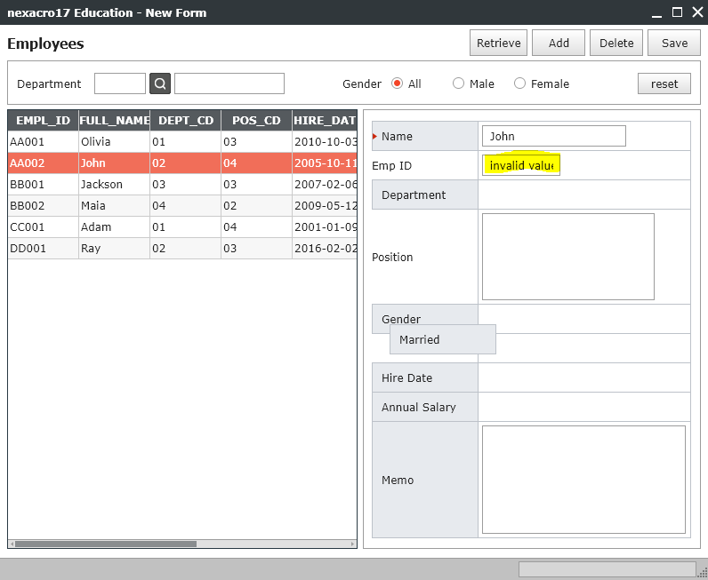 EMP_ID에 정상적인 값이 표현되지 않는다 이유는? invalid value는 컴포넌트 입장(MaskEdit)에서 컴포넌트가 원하는 데이터 형태로 값이 안들어오면 정상적으로 값을 표현할 수 없어 invalid value를 표현해 줍니다.