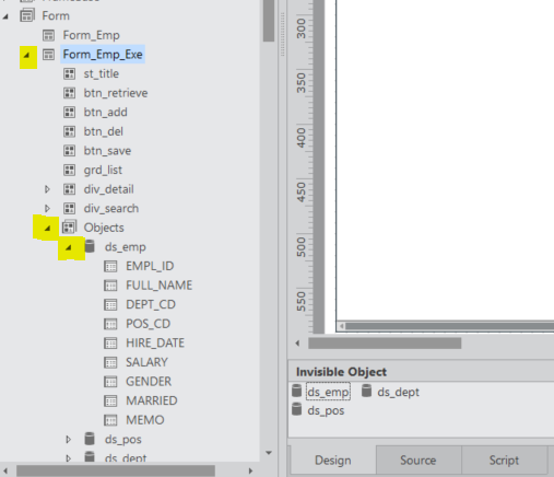 1. 2번째 방법을 이용하여 바인딩 해보기 화면에서 보고 있는 Form소스가 Form Service Group > form_Emp_Exe 인데 그 옆에 보면 오른쪽 화살표가 보인다 그걸 클릭하면 펼쳐진다 여기에 Objects에도 화살표가 있는게 그걸 누르면 펼쳐지는데 거기에 ds_emp Dataset이 보일것이다. 거기에서 다시한번 오른쪽 클릭하면 전체 컴포넌트 Dataset의 전체 컬럼 리스트가 다 나오게 된다. 순서 => Form Service Group > form_Emp_Exe > Objects > ds_emp Dataset > EMPL_ID