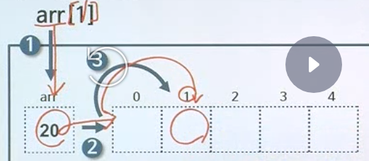 arr메모리에서 누굴 찾아가? arr 20인 배열의 주소값의 배열을 찾아가고 인덱스가 1이니까 1을 찾아갔다