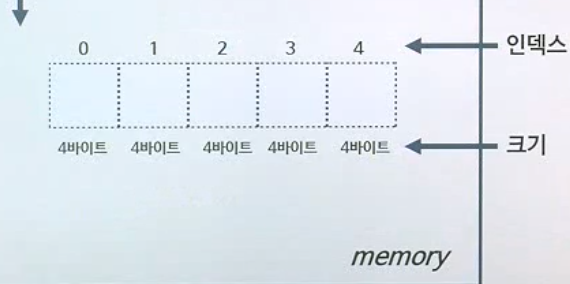 - int[5] : 무얼만들꺼냐? 4바이트 공간의 변수를 만들건데 몇개를 만들꺼냐면 5개를 만들겠다 그럼 5개짜리 배열이 메모리에 만들어진다'