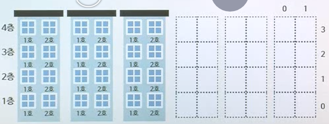 2차원 배열: 한 동 짜리 아파트 처러 층과 호수로 구성된 형태