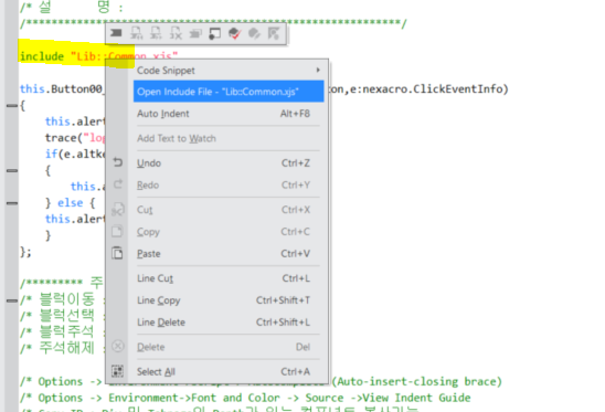 1. Mouse 오른쪽 클릭 > Open lnclude Fiel = "Lib::Common.xjs"를 선택해 바로 이동
