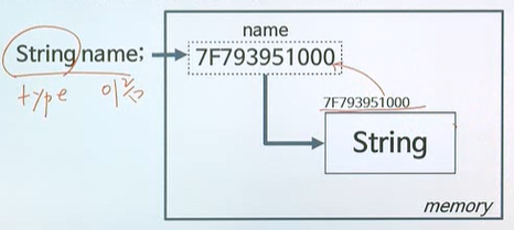 name이라는 변수를 선언 하는데 이안에 저장되는 데이터 타입을 뭘로줄거냐? String이다. string는 아까 기본데이터 타입의 8가지에 속하지 않는다. 그럼이건 뭐다? 참조타입이다. 그럼 name에는 어떤 값이 들어가냐면 String 타입의 메모리주소값이 들어간다 라고 생각하면 된다.