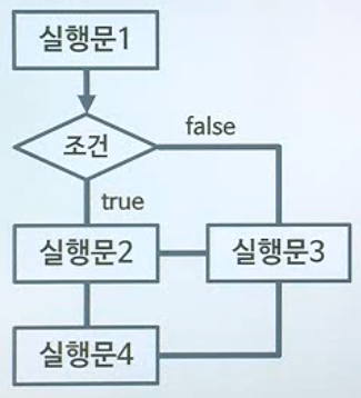 조건에 따라 다음에 실행할 명령문이 선택됨 순서도 1. 첫번째 실행문1 이 실행이 되었다 2. 그러고 나서 조건을 체크한다 이 조건이 3. true 여서 만족이 되면 실행문2를 실행을하고 4. false 그렇지 않다면 실행문3을 실행하고 5. 조건에 따라 실행문2 or 실행문3 중 둘중에 하나만 실행이 될것이고 6. 그게 실행이 끝나면 실행문 4가 실행이된다 예시 1. 성적계산 을 하였다 이 성적을 가지고 2. 점수>60 점수가 60점 보다 크냐? 라고 물어보고 있다 3. true 크다고 한다면 합격 4. false 작다고 한다면 불합격 5. 조건에 따라서 서로 다르게 처리하여 결과 통보
